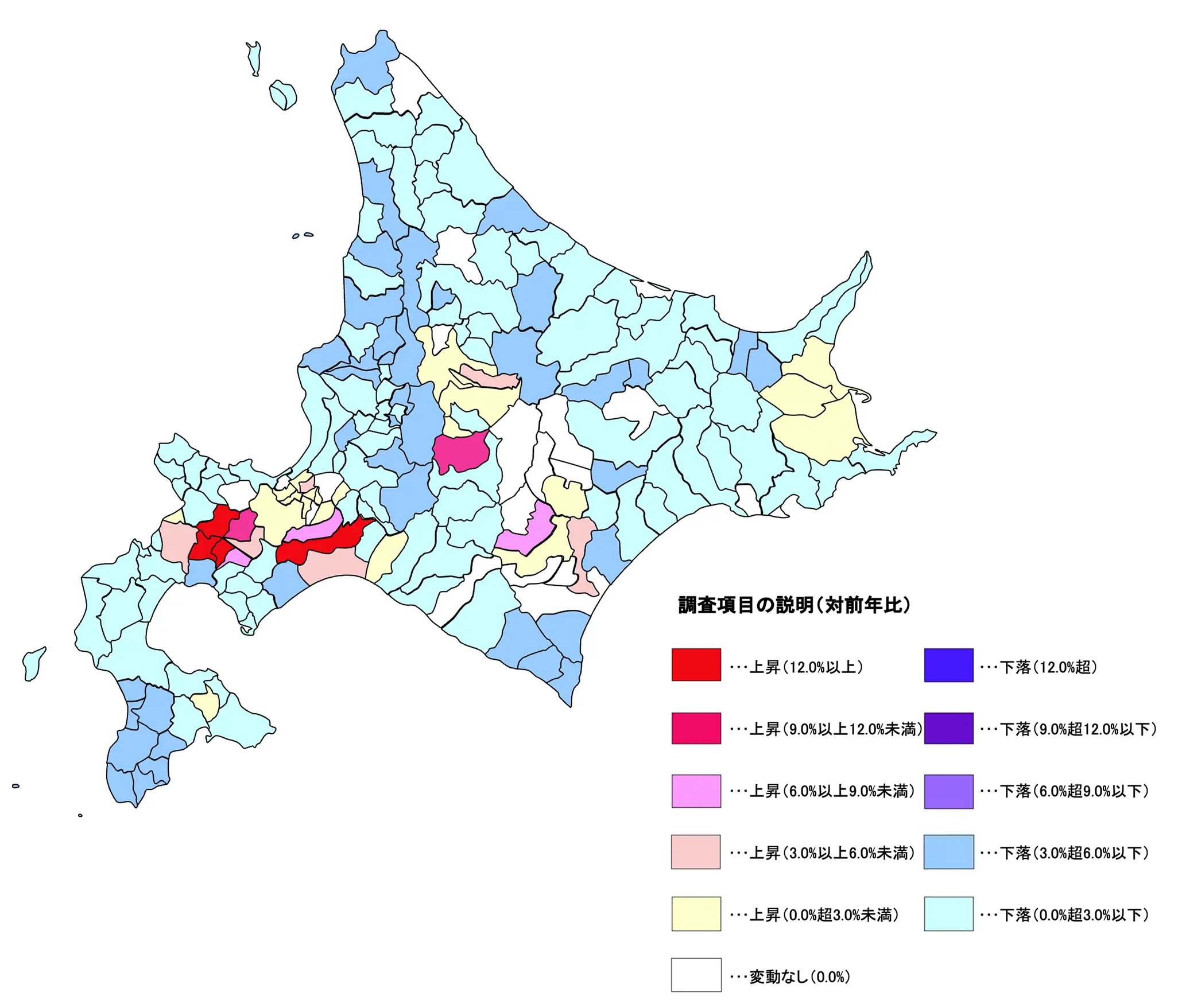 しかし、それ以外の地域に目を向けますと、少子高齢化の進行で人口減に歯止めがかからない市町村も多く、また、建築コストが依然として高止まりしていることなどから住宅地の価格の全道平均は前回調査から僅かながらも下落に転じ、商業地や工業地でも上昇幅は縮小する結果となりました。